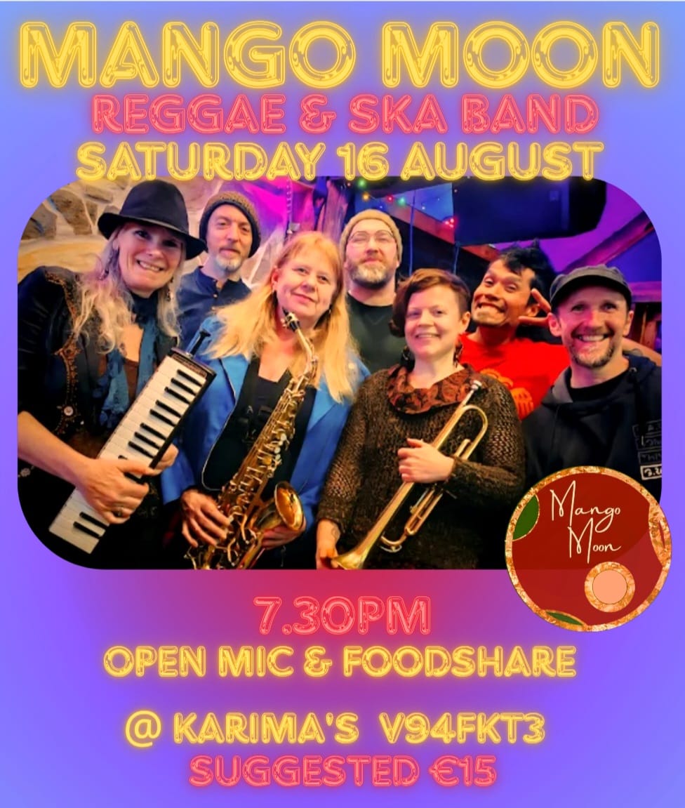 Mango Moon are a 7-piece Reggae/Ska/Dub Band from West Cork. Mango Moon bring an up-lifting big band sound, delivering reggae and ska infused grooves with rich brass & melodica riffs and vocal harmonies. Original songs celebrating love, life and freedom, with some classic covers thrown into the mix. Prepare to dance!
