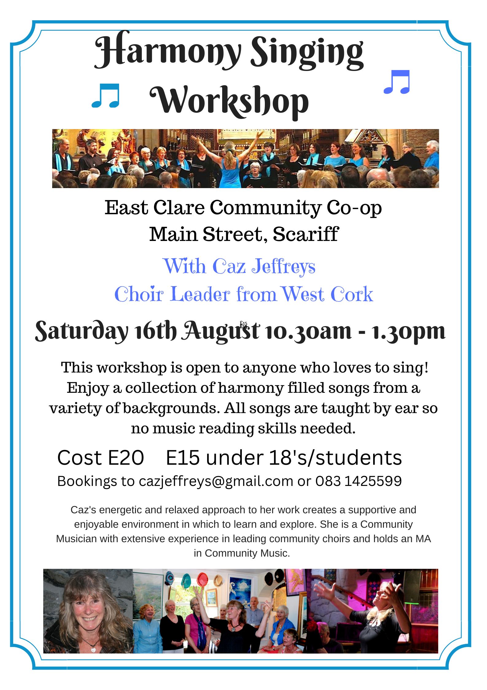 It’s been 7 years I think, since I last brought a Harmony Singing Workshop to Scariff….and I’m SO looking fowards to coming back! I’ll be bringing a great new collection of songs with me, all with inspiring harmonies of course. Please help to spread the word and let others know…can’t wait to sing with you all again!