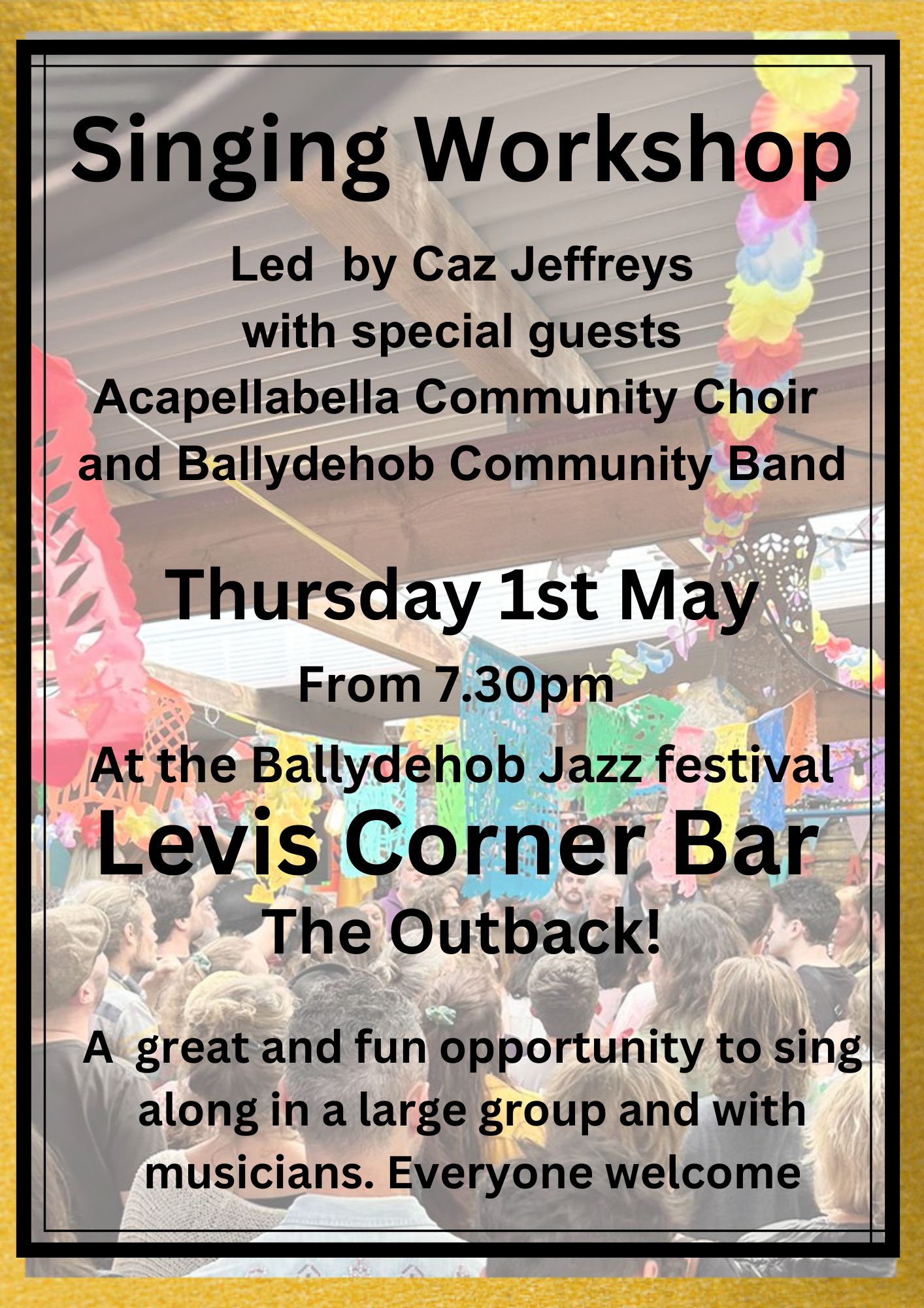 Really looking forwards to this!! Another year passed, and here we are again singing and playing together in the Outback of Levis Corner Bar with Acapellabella and Ballydehob Community Band….Thursday 1st May from 7.30pm. Great way to kick off the Festival celebrations. Do come along and join us…a great vibe and opportunity for a good ol’ sing with loads of voices. Hope to see you there.
